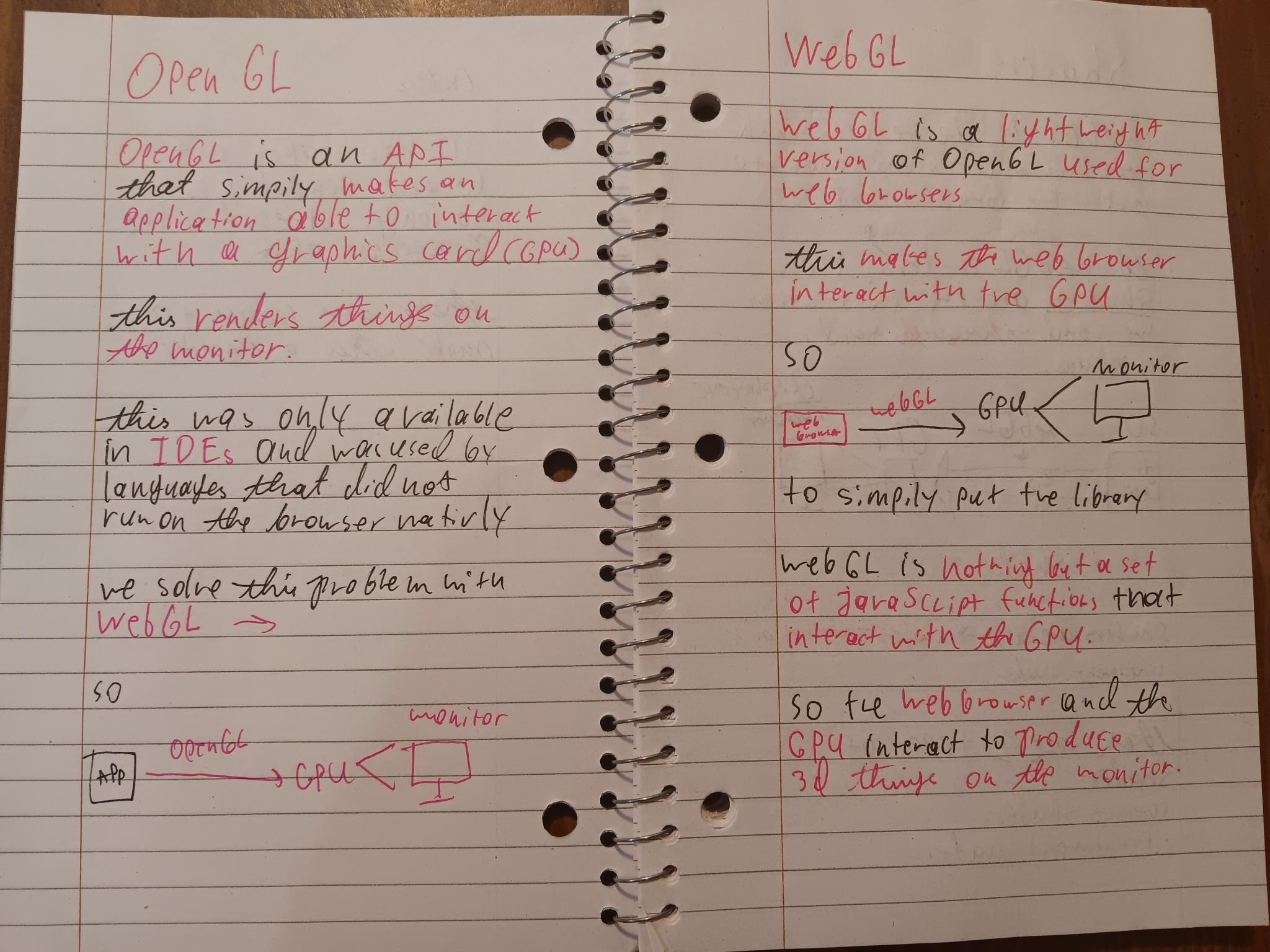 To take a step back we need to know what WebGL is and that is a complicated topic. To put it in shorter terms OpenGL is a library that directly accesses a graphics cards hardware to render vertices faster, WebGL is built on top of that to be used on websites.
